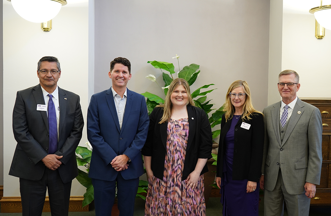 From left to right are: UNI Provost José Herrera, awardee Joshua Wilkinson, awardee Kaitlyn Vasey, UNI College of Humanities, Arts & Sciences Interim Dean Jennifer Cooley and UNI President Mark Nook.